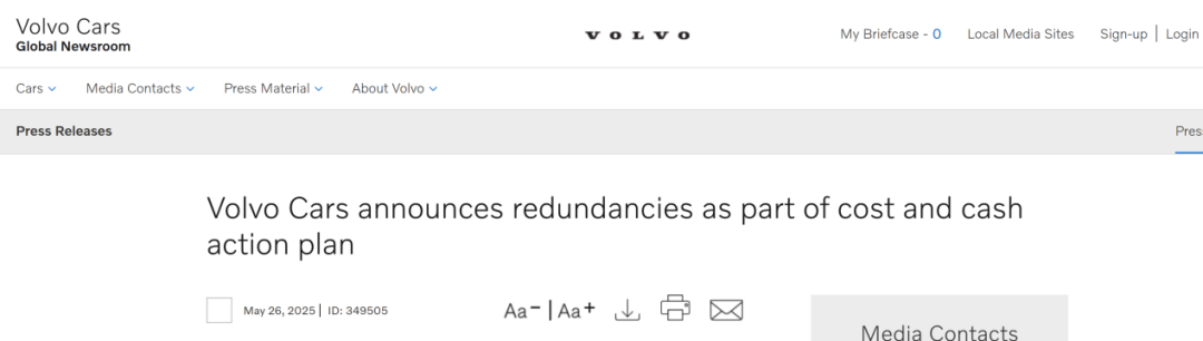 5月26日,沃尔沃汽车宣布在全球范围内裁员,涉及约3000名员工。